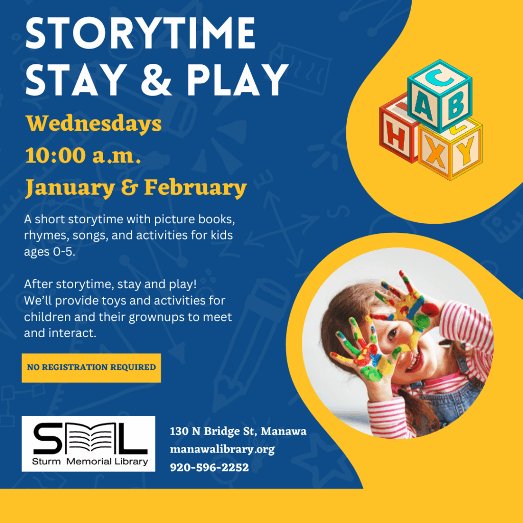 Storytime Stay & Play / News / By lhokenstad A short storytime with picture books, rhymes, songs, and activities for children ages 0-5.After storytime, stay and play!We’ll provide toys and activities for children and their grownups to meet and interact. Archives December 2025 October 2025 August 2025 June 2025 February 2025 January 2025 November 2024 September 2024 May 2024 August 2023 December 2022 Recent Posts Holiday Closings Storytime Stay & Play Library Opens at 12:00 p.m. on Thursday Dec. 18 Community Craft Connection Preschool Storytime Wednesdays at 10:00 a.m. Search for: Search