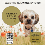 - 17Adult Craft: Fabric Pumpkin10:00 am - 11:00 amJoin us for a fun adult crafting session where we’ll be making some adorable no-sew pumpkins—perfect for adding a cozy touch to your autumn decor! We’ll provide all the materials you’ll need and offer plenty of hands-on assistance. Remember, space is limited, so don’t forget to register in advance. We can’t , ...Sage, the Tail Waggin’ Tutor3:15 pm - 4:15 pmSage the Tail Waggin’ Tutor loves listening to children read. Do you think you could pick out a story she’d like? This program provides children with the opportunity to practice their reading skills in a supportive environment. By reading aloud to a dog, children can eliminate the fear of judgment and feel more a , ...
