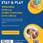 - 8Storytime Stay and Play10:00 amA short storytime with picture books, rhymes, songs, and activities for children ages 0-5. After storytime, stay and play! We’ll provide toys and activities for children and their grownups to meet and interact. , ...