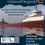 - 22Storytime Stay and Play10:00 amA short storytime with picture books, rhymes, songs, and activities for children ages 0-5. After storytime, stay and play! We’ll provide toys and activities for children and their grownups to meet and interact. , ...The Wreck of the Edmund Fitzgerald: The Ship, the Storm and the Song5:00 pm - 6:00 pmThe year 2025 marks the 50th anniversary of the Edmund Fitzgerald disaster, which occurred during a fierce storm on Lake Superior in 1975. The ship sank while carrying over 26,000 tons of iron ore, resulting in the loss of 29 crew members. This tragedy is famously remembered in Gordon Lightfoot’s song “The , ...