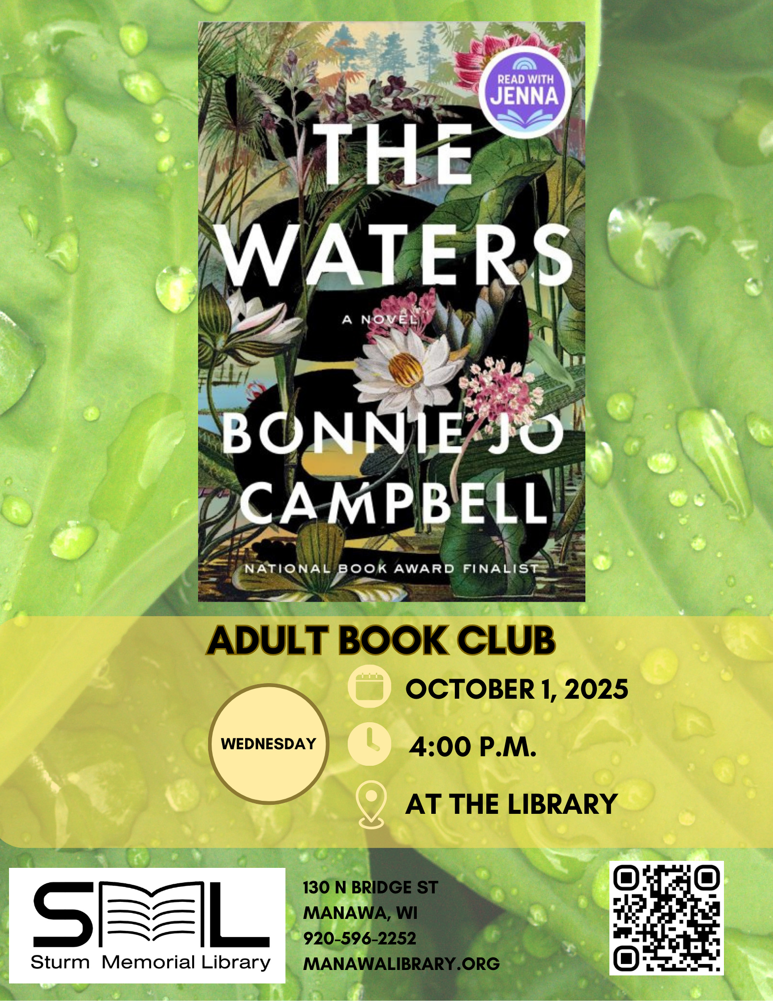 The SML Adult Book Club will meet on Wednesday, October 1, to discuss “The Waters” by Bonnie Jo Campbell.