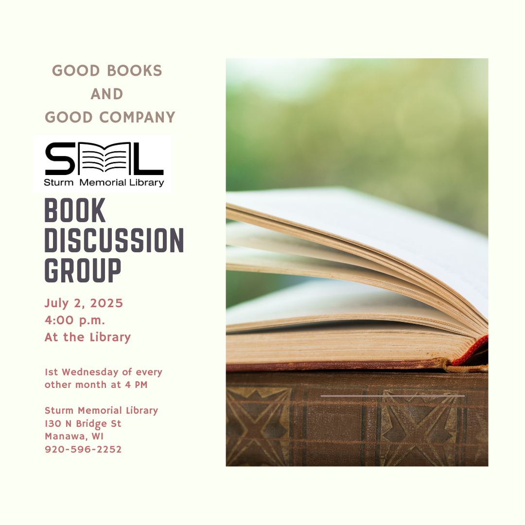 The Sturm Memorial Library Book Discussion Group meets the first Wednesday of every other month at 4:00 p.m.