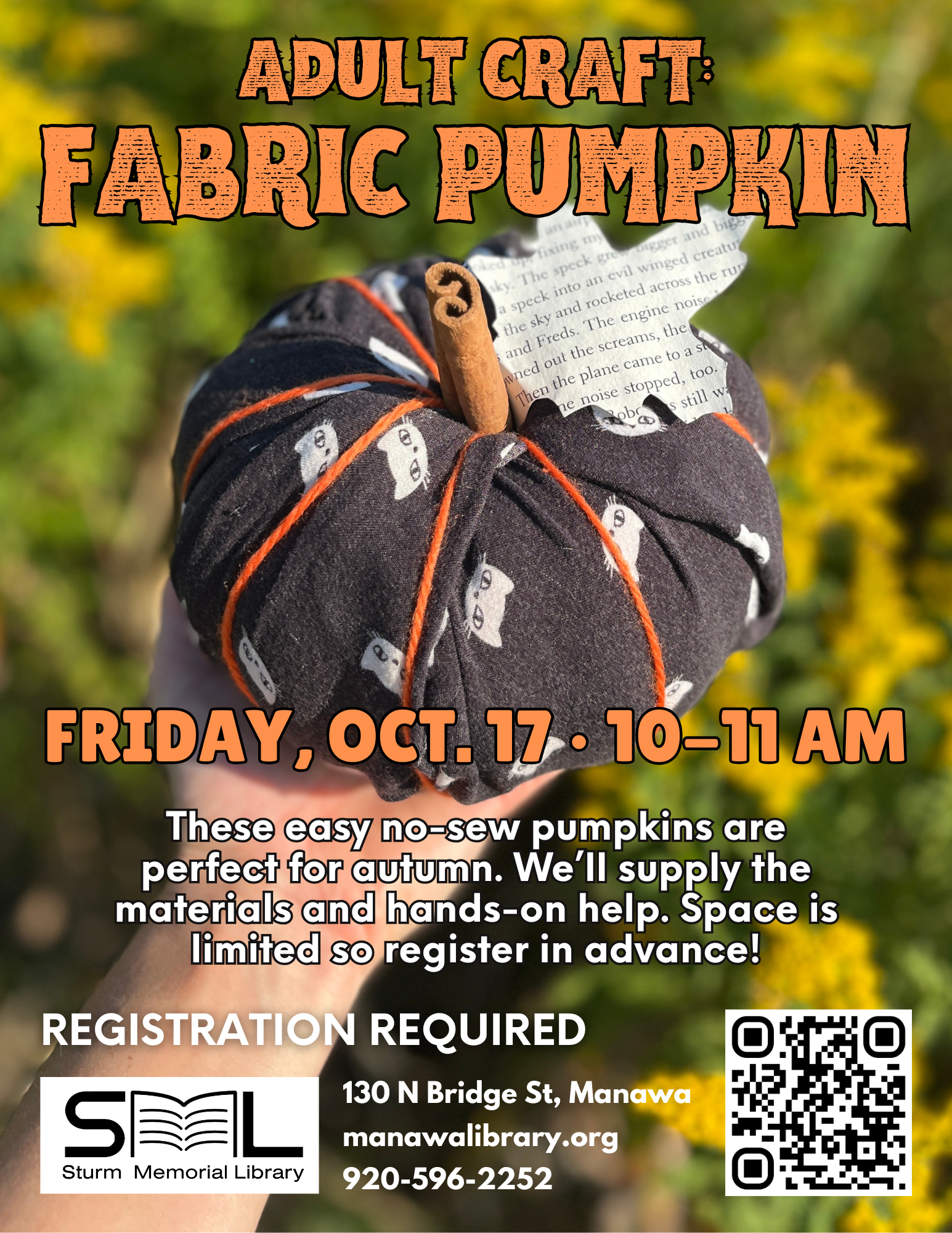 Join us for a fun adult crafting session where we’ll be making some adorable no-sew pumpkins—perfect for adding a cozy touch to your autumn decor! We’ll provide all the materials you’ll need and offer plenty of hands-on assistance. Remember, space is limited, so don’t forget to register in advance. We can’t wait to see you there! 🍂🧡