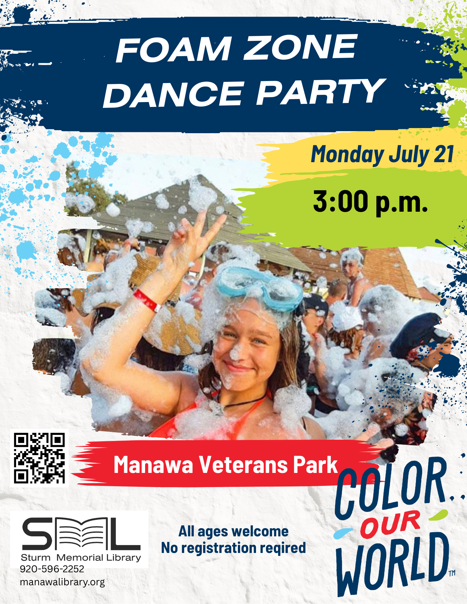 Join us for a fun-filled event where we’ll fill an area with mountains of bubbles, allowing kids and their grown-ups to play and enjoy family-friendly dance music. Come dressed This event is at the Manawa Area Veterans Freedom Park. Please consider wearing lightweight, quick-drying clothing or swimwear.