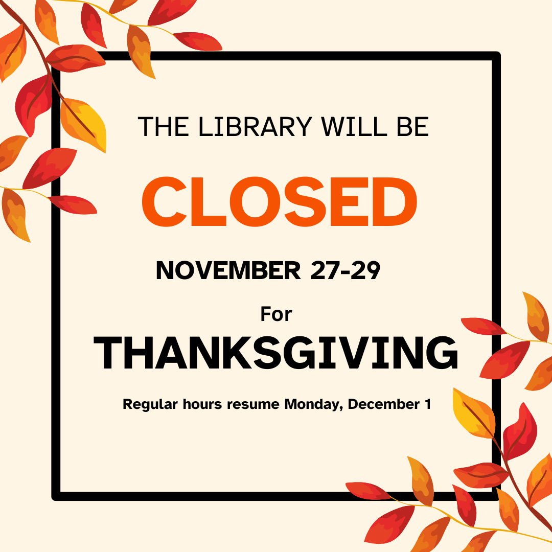 Library Closed The library will be closed November 27-29 for Thanksgiving. Regular hours resume on Monday December 1. + Add to Google Calendar + iCal / Outlook export 00 days 00 hours 00 minutes 00 seconds Date Nov 27 2025 Time All Day Category All Ages Share this event
