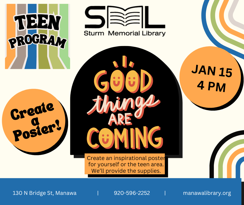 TAB will make posters for the teen area on January 15, 2026. Bring ideas for the posters or brainstorm with the group during this meeting. Supplies will be provided for the posters.
